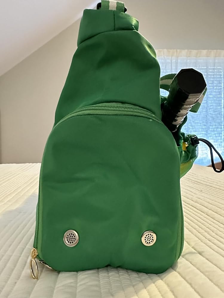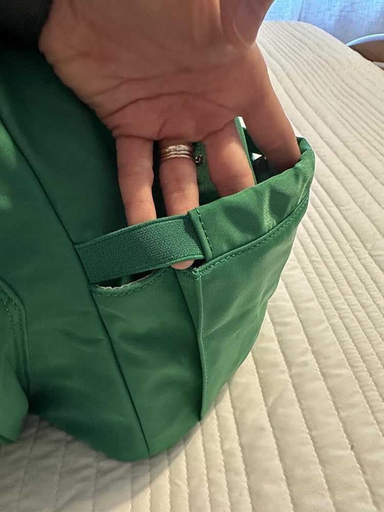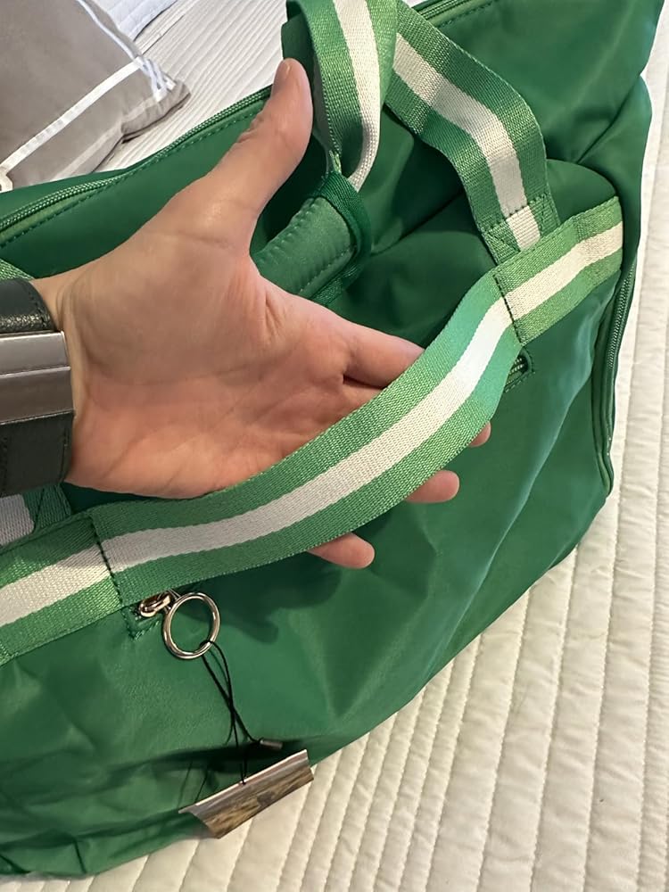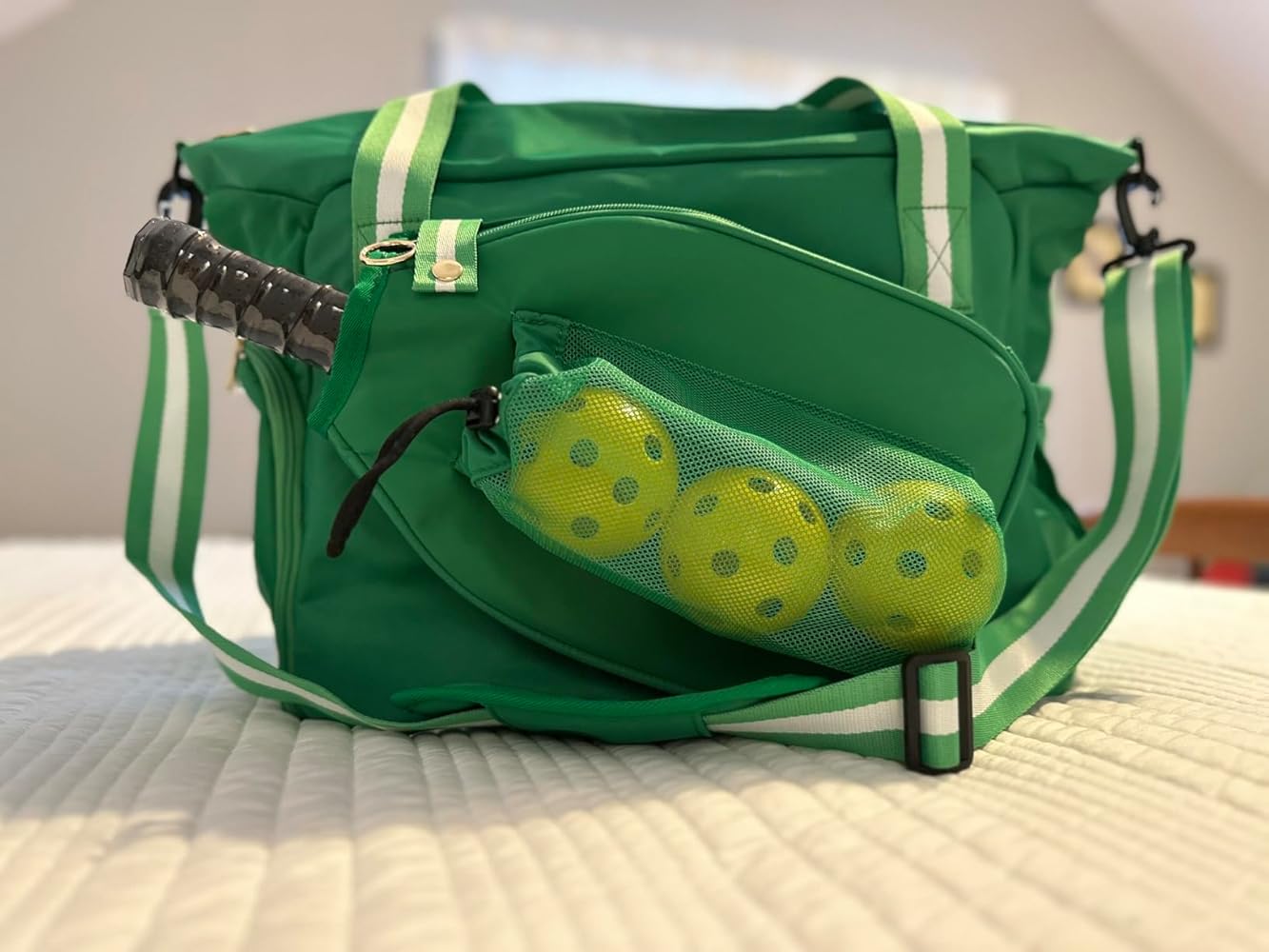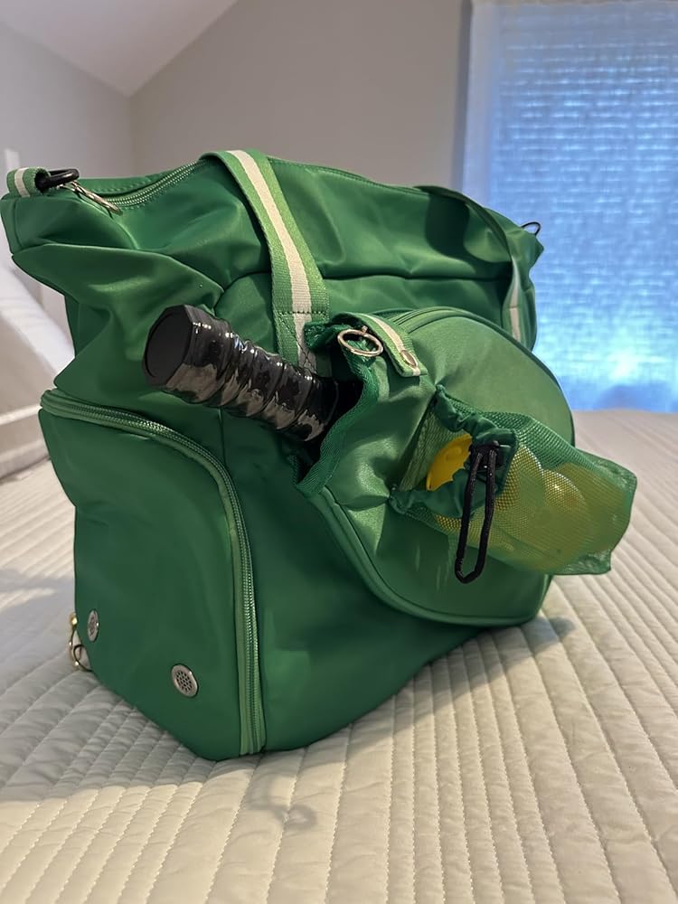 Honestly, I would not blink if this bag cost twice what they are charging for it. Everything about it feels much higher-end than the price would suggest. The color is a gorgeous, vibrant green (much prettier than it looks on the computer screen), and the fabric feels almost luxurious - very thick and with a lovely sheen. Every feature, down to the zippers and straps, looks designer-quality. I could go on for an entire essay about how impressed I am with this bag! It has lots of compartments to keep your gear organized, including a shoe compartment, multiple slip pockets and internal zipper pockets, a water bottle compartment, and of course a place to stow your paddle and pickleballs. It even has a strap to go over the handle of a suitcase in case you decide to travel with it. I would recommend this bag to anyone who plays pickleball!